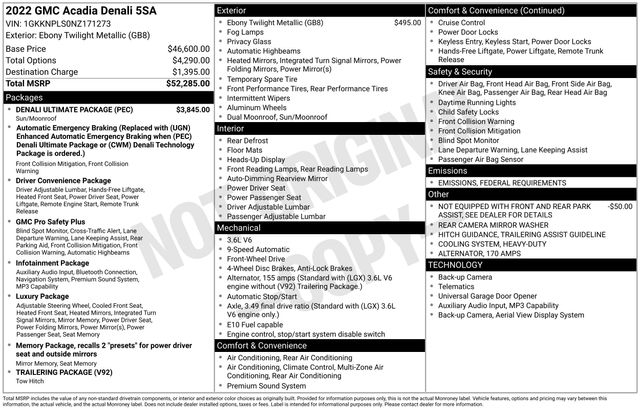 170 Amp Alternator, Adaptive Cruise Control, Denali Technology Package, Denali Ultimate Package, Dual SkyScape 2-Panel Power Sunroof, Enhanced Automatic Emergency Braking, HD Surround Vision, Heavy-Duty Cooling System, Hitch Guidance w/Hitch View, Navigation System, Rear Camera Mirror, Rear Camera Mirror Washer, Trailering Assist Guidelines, Trailering Package, 20" Ultra Bright Machined Aluminum Wheels, 3.49 Final Drive Axle Ratio, 3rd row seats: split-bench, 4-Wheel Disc Brakes, 6-Passenger (2-2-2 Seating Configuration), 8 Speakers, 8-Way Power Driver Seat Adjuster, 8-Way Power Passenger Seat Adjuster, ABS brakes, Air Conditioning, Alloy wheels, AM/FM radio: SiriusXM with 360L, Apple CarPlay/Android Auto, Auto High-beam Headlights, Auto-dimming door mirrors, Auto-dimming Rear-View mirror, Automatic temperature control, Bose Premium 8-Speaker Audio System Feature, Brake assist, Bumpers: body-color, Compass, Delay-off headlights, Driver door bin, Driver vanity mirror, Dual front impact airbags, Dual front side impact airbags, Electronic Cruise Control w/Set & Resume Speed, Electronic Stability Control, Emergency communication system: OnStar and GMC Connected Services capable, Four wheel independent suspension, Front anti-roll bar, Front Bucket Seats, Front Center Armrest, Front dual zone A/C, Front fog lights, Front reading lights, Fully automatic headlights, Garage door transmitter, Heads-Up Display, Heated & Ventilated Driver & Front Passenger Seats, Heated door mirrors, Heated Driver & Front Passenger Seats, Heated front seats, Heated Rear Outboard Seating Positions, Heated rear seats, Heated steering wheel, Illuminated entry, Knee airbag, Low tire pressure warning, Memory seat, Not Equipped w/Front & Rear Park Assist, Occupant sensing airbag, Outside temperature display, Overhead airbag, Overhead console, Panic alarm, Passenger door bin, Passenger vanity mirror, Perforated Leather-Appointed Seat Trim, Power door mirrors, Power Driver Lumbar Control Seat Adjuster, Power driver seat, Power Liftgate, Power Passenger Lumbar Control Seat Adjuster, Power passenger seat, Power steering, Power windows, Preferred Equipment Group 5SA, Premium audio system: GMC Infotainment System, Radio data system, Radio: AM/FM 8" Diagonal Multi-Touch Navigation, Rear air conditioning, Rear anti-roll bar, Rear reading lights, Rear window defroster, Rear window wiper, Remote keyless entry, Roof rack: rails only, Security system, SiriusXM w/360L, Speed control, Speed-sensing steering, Spoiler, Steering wheel memory, Steering wheel mounted audio controls, Tachometer, Telescoping steering wheel, Tilt steering wheel, Traction control, Trip computer, Turn signal indicator mirrors, Variably intermittent wipers, Ventilated front seats, Voltmeter, Wireless Apple CarPlay/Wireless Android Auto, 170 Amp Alternator, Adaptive Cruise Control, Denali Technology Package, Denali Ultimate Package, Dual SkyScape 2-Panel Power Sunroof, Enhanced Automatic Emergency Braking, HD Surround Vision, Heavy-Duty Cooling System, Hitch Guidance w/Hitch View, Navigation System, Rear Camera Mirror, Rear Camera Mirror Washer, Trailering Assist Guidelines, Trailering Package.