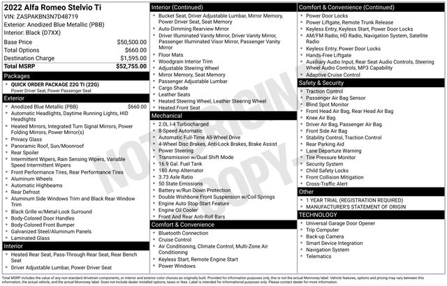 Navigation System, 3.73 Axle Ratio, 4-Wheel Disc Brakes, 8 Speakers, ABS brakes, Air Conditioning, Alloy wheels, AM/FM radio: SiriusXM, Apple CarPlay/Android Auto, Auto High-beam Headlights, Auto-dimming door mirrors, Auto-dimming Rear-View mirror, Automatic temperature control, Brake assist, Bumpers: body-color, Compass, Delay-off headlights, Driver door bin, Driver vanity mirror, Dual front impact airbags, Dual front side impact airbags, Electronic Stability Control, Emergency communication system: SiriusXM Guardian - included trial, Four wheel independent suspension, Front anti-roll bar, Front Bucket Seats, Front Center Armrest, Front dual zone A/C, Front reading lights, Fully automatic headlights, Garage door transmitter, Genuine wood console insert, Genuine wood dashboard insert, Genuine wood door panel insert, Headlight cleaning, Heated door mirrors, Heated front seats, Heated rear seats, Heated steering wheel, High intensity discharge headlights: Bi-Xenon, Illuminated entry, Knee airbag, Leather Seats, Leather Shift Knob, Leather steering wheel, Low tire pressure warning, Manufacturer's Statement of Origin, Memory seat, Occupant sensing airbag, Outside temperature display, Overhead airbag, Overhead console, Panic alarm, ParkView Rear Back-Up Camera, Passenger door bin, Passenger vanity mirror, Power 6-Way Adjustable Driver Seat, Power 6-Way Front Passenger Seat, Power door mirrors, Power driver seat, Power Liftgate, Power moonroof, Power passenger seat, Power steering, Power windows, Quick Order Package 22G Ti, Radio data system, Radio: AM/FM/HD 8.8" w/Navigation, Rain sensing wipers, Rear anti-roll bar, Rear audio controls, Rear fog lights, Rear reading lights, Rear seat center armrest, Rear window defroster, Rear window wiper, Remote keyless entry, Security system, Silver Ti Badge, Speed control, Speed-sensing steering, Speed-Sensitive Wipers, Split folding rear seat, Spoiler, Sport steering wheel, Steering wheel mounted audio controls, Tachometer, Telescoping steering wheel, Tilt steering wheel, Traction control, Trip computer, Turn signal indicator mirrors, Variably intermittent wipers, Vesuvio Gray Body Kit, Wheels: 19" x 8.0" Sport 5-Hole Aluminum, Navigation System.