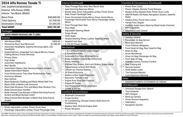 Apple CarPlay/Android Auto, Navigation System, ParkView Rear Back-Up Camera, Power Liftgate, Power Moonroof, Quick Order Package 28D Ti, Radio: Uconnect 5 Nav w/10.25" Display, Speed control, 4-Wheel Disc Brakes, 6 Speakers, ABS brakes, Air Conditioning, Alloy wheels, AM/FM radio: SiriusXM, Anti-whiplash front head restraints, Auto High-beam Headlights, Auto-dimming Rear-View mirror, Automatic temperature control, Brake assist, Bumpers: body-color, Compass, Delay-off headlights, Driver door bin, Driver vanity mirror, Dual front impact airbags, Dual front side impact airbags, Electronic Stability Control, Emergency communication system, Four wheel independent suspension, Front anti-roll bar, Front Bucket Seats, Front Center Armrest w/Storage, Front dual zone A/C, Front fog lights, Front reading lights, Fully automatic headlights, Garage door transmitter, Heated door mirrors, Heated front seats, Heated steering wheel, Illuminated entry, Knee airbag, Leather steering wheel, Low tire pressure warning, Manufacturer's Statement of Origin, Occupant sensing airbag, Outside temperature display, Overhead airbag, Overhead console, Panic alarm, Passenger door bin, Passenger vanity mirror, Power door mirrors, Power driver seat, Power passenger seat, Power steering, Power windows, Rain sensing wipers, Rear anti-roll bar, Rear seat center armrest, Rear window defroster, Rear window wiper, Remote keyless entry, Security system, Split folding rear seat, Spoiler, Sport Cloth Seat w/Biscotto Stitching, Sport steering wheel, Steering wheel mounted audio controls, Tachometer, TBD Axle Ratio, Telescoping steering wheel, Tilt steering wheel, Traction control, Trip computer, Turn signal indicator mirrors, Variably intermittent wipers, Wheels: 18" x 7.5" Black Diamond Cut, ALL WHEEL DRIVE, Apple CarPlay/Android Auto, Navigation System, ParkView Rear Back-Up Camera, Power Liftgate, Power Moonroof, Quick Order Package 28D Ti, Radio: Uconnect 5 Nav w/10.25" Display, Speed control.