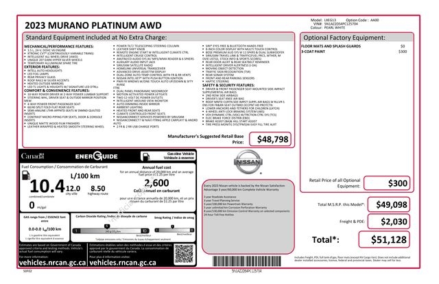 Exterior Parking Camera Rear, Heated & Ventilated Front Bucket Seats, Navigation system: NissanConnect Navigation, NissanConnect featuring Apple CarPlay and Android Auto, Power Liftgate, Power moonroof, Speed control, Wheels: 20" Unique Dark Hyper Silver, 11 Speakers, 4-Wheel Disc Brakes, 4.667 Axle Ratio, ABS brakes, Air Conditioning, Alloy wheels, AM/FM radio: SiriusXM, AM/FM/CD/MP3/WMA Audio System, Auto High-beam Headlights, Auto tilt-away steering wheel, Auto-dimming Rear-View mirror, Automatic temperature control, Blind Spot Warning, Brake assist, Bumpers: body-color, CD player, Child-Seat-Sensing Airbag, Delay-off headlights, Driver door bin, Driver vanity mirror, Dual front impact airbags, Dual front side impact airbags, Electronic Stability Control, Emergency communication system: NissanConnect Services (first 6 months included), Four wheel independent suspension, Front anti-roll bar, Front Bucket Seats, Front Center Armrest, Front dual zone A/C, Front fog lights, Front reading lights, Fully automatic headlights, Garage door transmitter: HomeLink, Heated door mirrors, Heated front seats, Heated rear seats, Heated steering wheel, Illuminated entry, Knee airbag, Low tire pressure warning, Memory seat, NissanConnect Services Powered By SiriusXM, Occupant sensing airbag, Outside temperature display, Overhead airbag, Overhead console, Panic alarm, Passenger door bin, Passenger vanity mirror, Power door mirrors, Power driver seat, Power passenger seat, Power steering, Power windows, Premium audio system: Bose, Radio data system, Rear anti-roll bar, Rear reading lights, Rear seat center armrest, Rear side impact airbag, Rear window defroster, Rear window wiper, Remote keyless entry, Security system, Semi-Aniline Leather-Appointed Seat Trim, Speed-sensing steering, Speed-Sensitive Wipers, Split folding rear seat, Spoiler, Steering wheel memory, Steering wheel mounted audio controls, Tachometer, Telescoping steering wheel, Tilt steering wheel, Traction control, Trip computer, Turn signal indicator mirrors, Variably intermittent wipers, Ventilated front seats, Exterior Parking Camera Rear, Heated & Ventilated Front Bucket Seats, Navigation system: NissanConnect Navigation, NissanConnect featuring Apple CarPlay and Android Auto, Power Liftgate, Power moonroof, Speed control, Wheels: 20" Unique Dark Hyper Silver.