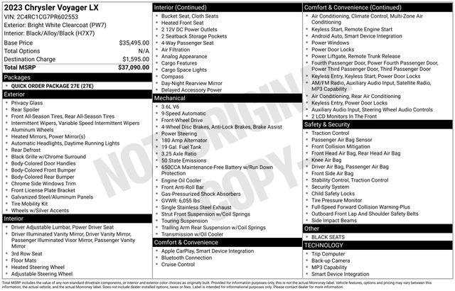 17" x 7" Aluminum Wheels, 3.25 Axle Ratio, 3rd row seats: split-bench, 4-Wheel Disc Brakes, 6 Speakers, ABS brakes, Air Conditioning, Alloy wheels, AM/FM radio: SiriusXM, Apple CarPlay, Apple CarPlay/Android Auto, Automatic temperature control, Black Seats, Brake assist, Bumpers: body-color, Cloth Bucket Seats, Compass, Delay-off headlights, Driver door bin, Driver vanity mirror, Driver's Seat Mounted Armrest, Dual front impact airbags, Dual front side impact airbags, Electronic Stability Control, Exterior Mirrors w/Heating Element, Four wheel independent suspension, Front anti-roll bar, Front Bucket Seats, Front dual zone A/C, Front reading lights, Fully automatic headlights, Google Android Auto, GPS Antenna Input, Heated door mirrors, Heated front seats, Heated steering wheel, Illuminated entry, Knee airbag, Low tire pressure warning, Occupant sensing airbag, Outside temperature display, Overhead airbag, Overhead console, Panic alarm, ParkView Rear Back-Up Camera, Passenger door bin, Passenger seat mounted armrest, Passenger vanity mirror, Power door mirrors, Power driver seat, Power Liftgate, Power steering, Power windows, Quick Order Package 27E, Radio data system, Radio: Uconnect 5 w/7" Display, Rear air conditioning, Rear window defroster, Rear window wiper, Reclining 3rd row seat, Remote keyless entry, Security system, Speed control, Split folding rear seat, Spoiler, Steering wheel mounted audio controls, Tachometer, Telescoping steering wheel, Tilt steering wheel, Touring Suspension, Traction control, Trip computer, USB Host Flip, Variably intermittent wipers, Voltmeter.