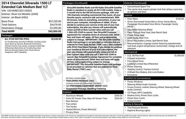 10-Way Power Driver's Seat Adjuster, 110-Volt AC Power Outlet, 150 Amp Alternator, 3.42 Rear Axle Ratio, 4-Wheel Disc Brakes, 4.2" Diagonal Color Display Driver Info Center, 40/20/40 Front Split Bench Seat, 6 Speaker Audio System, 6 Speakers, ABS brakes, Air Conditioning, All Star Edition, Alloy wheels, AM/FM radio: SiriusXM, Auxiliary External Transmission Oil Cooler, Black Power Adjustable Heated Outside Mirrors, Bluetooth® For Phone, Brake assist, Bumpers: chrome, CD player, Cloth Seat Trim, Color-Keyed Carpeting w/Rubberized Vinyl Floor Mats, Compass, Deep-Tinted Glass, Delay-off headlights, Driver & Front Passenger Illuminated Vanity Mirrors, Driver door bin, Driver vanity mirror, Dual front impact airbags, Dual front side impact airbags, Dual-Zone Automatic Climate Control, Electric Rear-Window Defogger, Electronic Stability Control, Emergency communication system: OnStar Directions & Connections, EZ Lift & Lower Tailgate, Front & Rear All-Weather Floor Mats (LPO) (DISC), Front anti-roll bar, Front Center Armrest w/Storage, Front Chrome Bumper, Front Frame-Mounted Black Recovery Hooks, Front Halogen Fog Lamps, Front reading lights, Front wheel independent suspension, Fully automatic headlights, Heated door mirrors, Heavy-Duty Rear Locking Differential, Illuminated entry, Integrated Trailer Brake Controller, Leather Wrapped Steering Wheel w/Cruise Controls, Low tire pressure warning, Manual Tilt Wheel Steering Column, Occupant sensing airbag, OnStar 6 Months Directions & Connections Plan, Outside temperature display, Overhead airbag, Overhead console, Panic alarm, Passenger door bin, Passenger vanity mirror, Power door mirrors, Power steering, Power windows, Power Windows w/Driver Express Up, Premium audio system: Chevrolet MyLink, Radio data system, Radio: AM/FM 8" Diagonal Color Touch Screen, Radio: AM/FM Audio System w/Chevrolet MyLink, Rear 60/40 Folding Bench Seat (Folds Up), Rear Chrome Bumper, Rear reading lights, Rear step bumper, Rear Vision Camera w/Dynamic Guide Lines, Rear Wheelhouse Liners, Remote Keyless Entry, Remote keyless entry, Remote Vehicle Starter System, Single Slot CD/MP3 Player, SiriusXM Satellite & HD Radio, Speed control, Speed-sensing steering, Split folding rear seat, Steering Wheel Audio Controls, Steering wheel mounted audio controls, Tachometer, Theft Deterrent System (Unauthorized Entry), Tilt steering wheel, Traction control, Trailering Equipment, Trip computer, Variably intermittent wipers, Voltmeter, Wheels: 17" x 8" Bright Machined Aluminum.